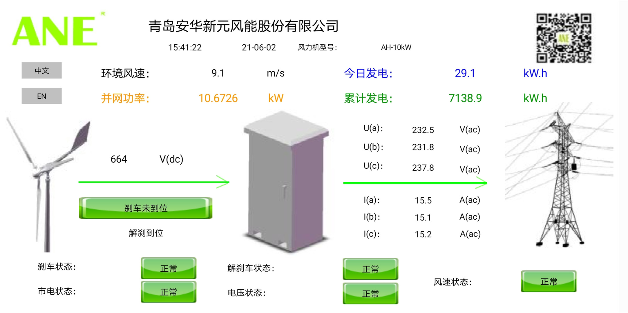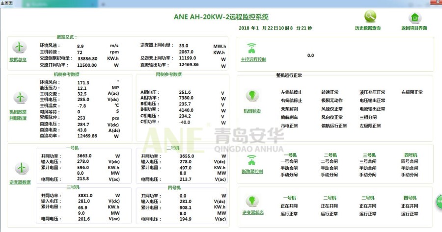 2、電氣控制功能:可檢測環(huán)境風(fēng)速、系統(tǒng)直流輸出電壓、到位開關(guān)信號等參數(shù),自動控制小型風(fēng)力發(fā)電機的停機和運行狀態(tài)。