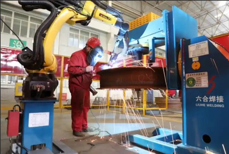 員工操控焊接機(jī)器人完成抽油機(jī)前輪焊接工作。