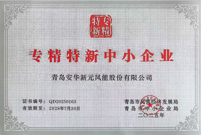 近年來,青島新元聚焦主業(yè)、精耕細作,堅定不移走專精特新發(fā)展道路,為產(chǎn)品在某些特定領(lǐng)域應(yīng)用積累了寶貴的技術(shù)儲備。“專精特新中小企業(yè)”殊榮是對我公司專業(yè)化、精細化發(fā)展的充分肯定,更彰顯了我司在小型風(fēng)力發(fā)電機細分領(lǐng)域的影響力。