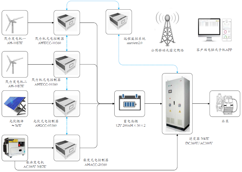 此方案主要利用新能源發(fā)電,重點解決無電網地區(qū)的供電問題,如無電村落供電、通信基站供電、監(jiān)控設備供電等。